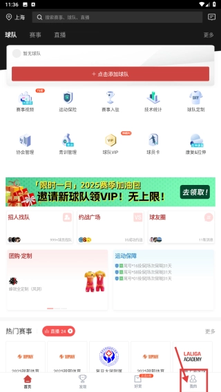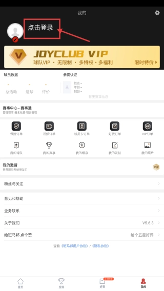 打开足球社交类应用,点击底部的“我的”选项,就能进入个人中心页面。