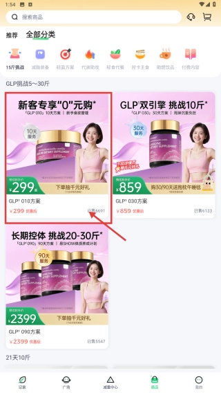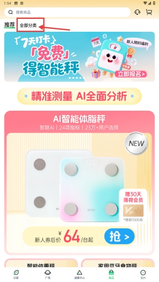 打开体重管理类应用,点击底部的商品选项,就能进入商品商城页面。