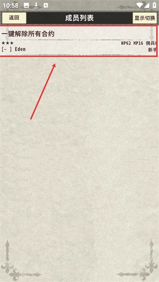 查看【成员列表】里【Eden】的【HP62】【MP16】状态,核实合约详情,对佣兵进行管理来优化队伍配置,增强战斗能力。