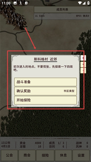 在【斯科格村近郊】界面选择【战斗准备】,检查装备与队伍状态,确认奖励后开启探险,感受中世纪战斗的乐趣。