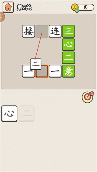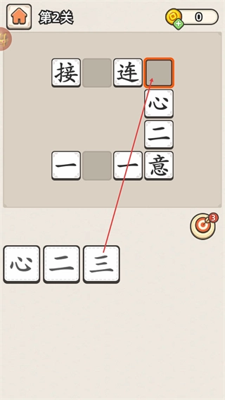 把下方的“二”拖入空格,补全“接二连三”这个词,然后再处理“一X一意”里的空格。