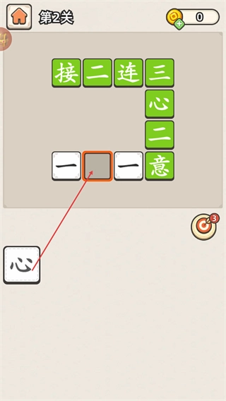 把下面的“三”拖到上面的空格中,组成“接三连X”,接着再拖动“心”和“二”,把成语的部件补充完整。