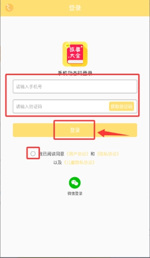 输入手机号及验证码并勾选协议,完成登录。