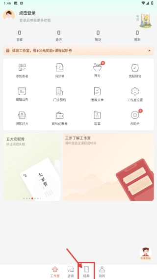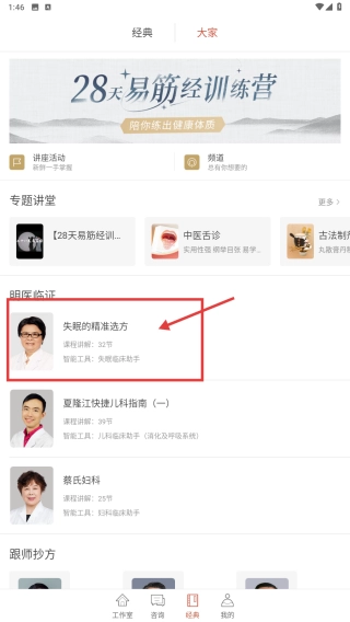 打开中医学习类应用,点击底部的经典选项,即可进入经典课程页面。
