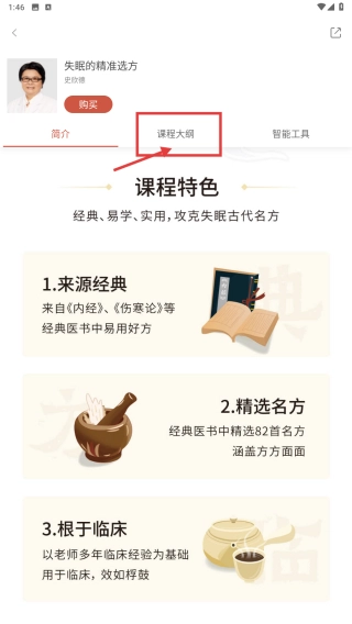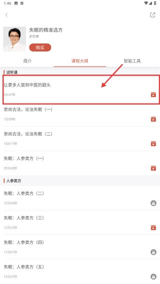 在经典课程页面找到“失眠的精准选方”这一课程条目并点击,即可进入该课程的详情页面。