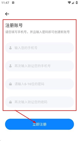 在输入手机号、密码等相关信息后,点击“立即注册”按钮,即可完成账号的注册流程。