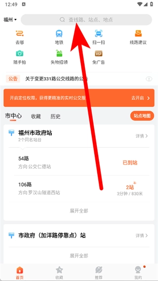 打开掌上公交应用后,点击页面顶部用于查询线路、站点和地点的搜索框。