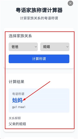 随后我们点击后,即可查看计算结果中粤语称谓“姑妈”及其关系的解释。