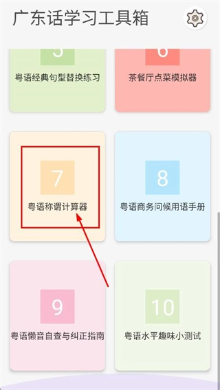 在学习工具箱页面,找到并点击粤语称谓计算器,即可进入对应的粤语家族称谓计算器页面。