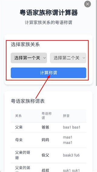 在粤语家族称谓计算器页面,先选择家族关系,再点击计算称谓按钮,即可得出对应的称谓。