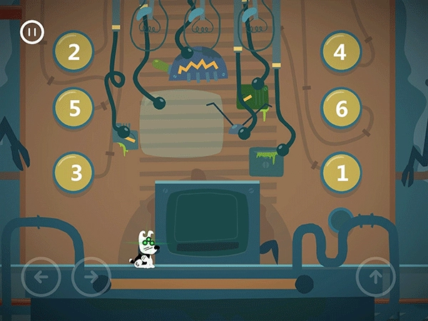 当按下左侧的黄色按钮时,右侧的门便会启动计时并开始下落。操作这块板时,需先从右往左将其调整至最低位置,这样就能顺利吃掉灯泡和骨头,然后通过闸门。务必保持冷静,不要慌张。