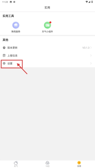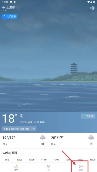 打开天气类应用,点击底部的实用选项,进入实用板块。