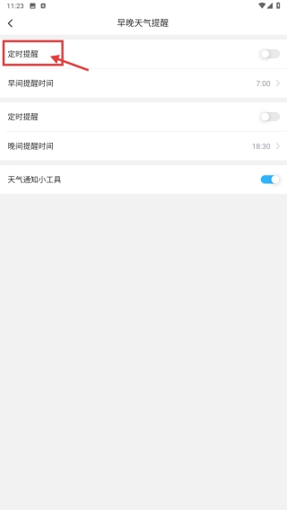 在早晚天气提醒页面,找到定时提醒功能,可根据需求开启或设置早间、晚间提醒时间。
