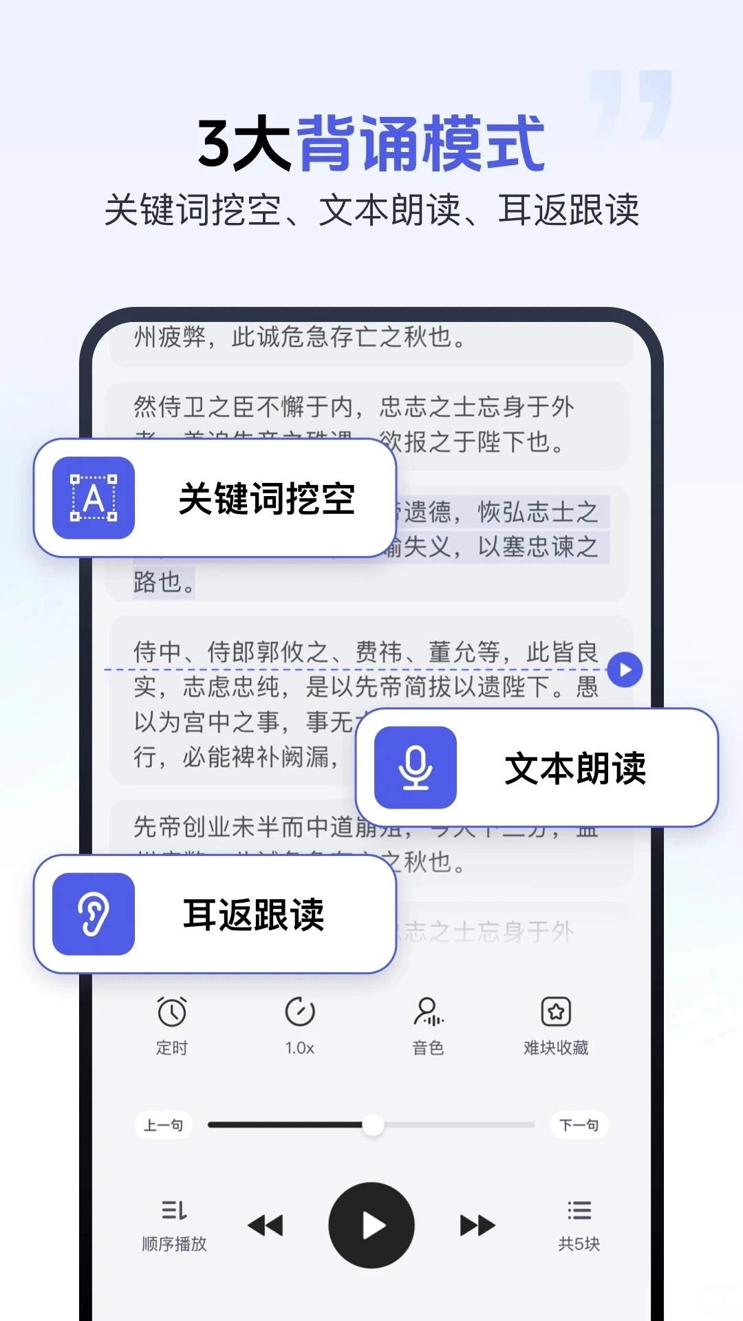 陪练出题督背:全程陪练模式借助智能手段监督背诵的进度与节奏,同时结合智能出题来归纳总结重点内容,构建起完整的学习闭环,助力用户在练习过程中巩固记忆,防止遗忘。