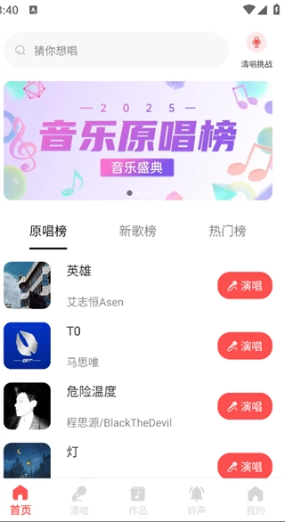 在首页就能清晰看到原唱榜、新歌榜、热门榜等分类板块。