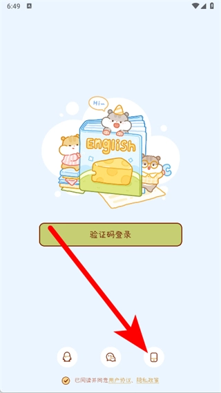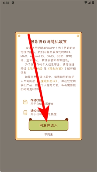 打开奶酪单词应用后,当出现服务协议与隐私政策的弹窗时,点击同意按钮即可进入应用。