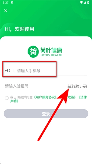 在登录界面,于输入框内填入手机号码,接着点击获取验证码的按钮。