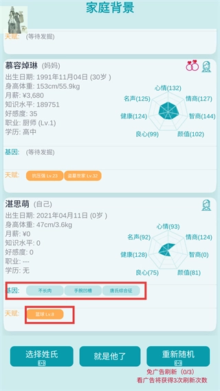 在家庭背景界面,核实角色【湛思萌】的基因及天赋【篮球-Lv.8】,点击【就是他了】,即可正式开启游戏。