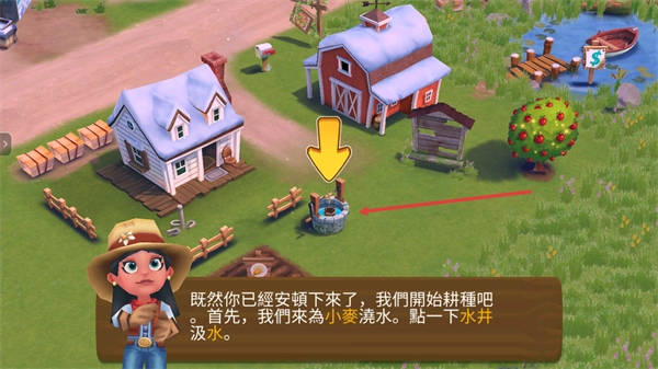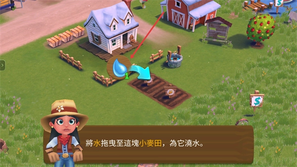 解锁农舍后,点击农场里的水井进行汲水,就能得到后续灌溉作物需要的水源。这是耕种前必须完成的准备工作,能确保作物种植时有充足的水源供应。