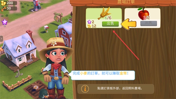 小麦收割完成后,点击订单面板选择对应小麦的订单进行售卖,交易成功后就能获得金币奖励,接着回到农场继续扩大种植规模,以此达成初期的经营收入。