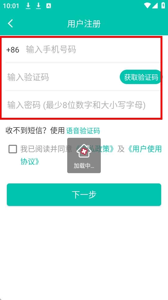 在进行用户注册操作时,需要按顺序填写【手机号码】、【验证码】以及【密码】这三项信息,全部填写完毕后,就可以点击“下一步”按钮继续后续流程。