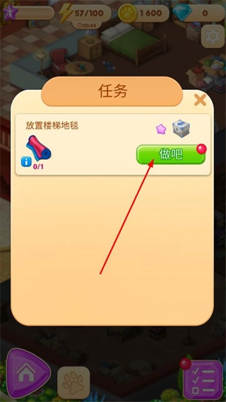 点击任务界面的“做吧”按钮,按照任务要求,利用通过合并得到的道具来完成别墅的装修工作。