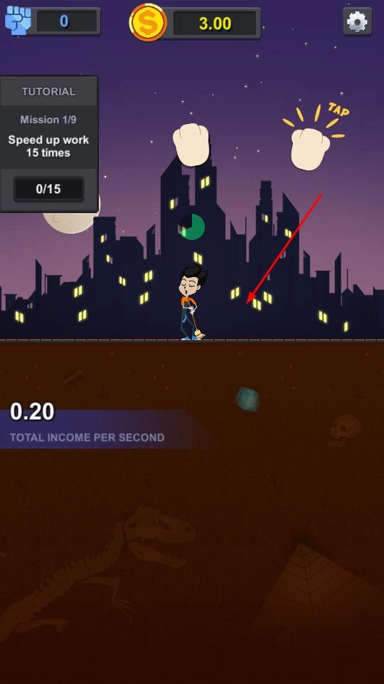 屏幕上方闪烁着“TAP”提示的拳头区域,会同步推动左侧教程任务“Speed up work 15 times”的进度条前进,底部的“TOTAL INCOME PER SECOND”数值会随着点击频率慢慢增加,以此来积累最初的收益。