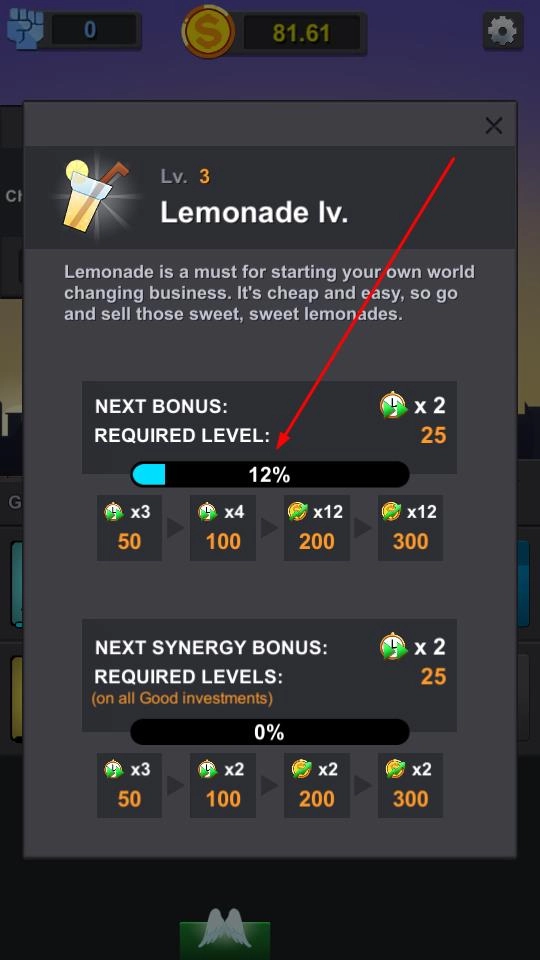 点击已创建的Lemonade建筑图标,会弹出详情界面,此时将注意力集中在Lemonade的等级信息栏,查看NEXT BONUS下方的进度条(例如显示12%),然后统一规划升级所有属于Good investments类别的建筑,以此来激活协同收益的加成效果。