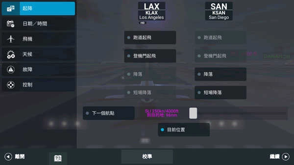 天气/气象起降:可自定义或选择真实模式,包含风向/风速、主要天气状况(晴天、雾天、雨天、风暴、雪天)、云量、云底高度、湍流强度以及地面温度等参数设置。
