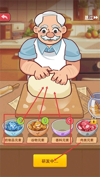 进入研发界面后,挑选【奶制品元素-1】【谷物元素-1】这类材料,接着点击【研发中...】按钮,就能启动新菜品的研发流程。