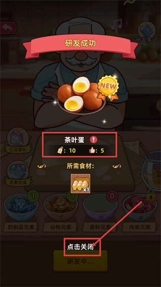 研发成功解锁新菜品【茶叶蛋】,该菜品售价为-10、好评值为-5,点击【点击关闭】按钮关闭弹窗后,此菜品将自动添加至经营列表中。