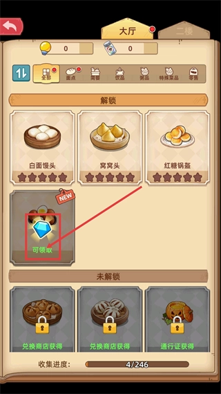 在菜单的解锁列表里,找到新研发的菜品,点击它旁边的【可领取】标识,就能得到钻石奖励,扩充资源储备。
