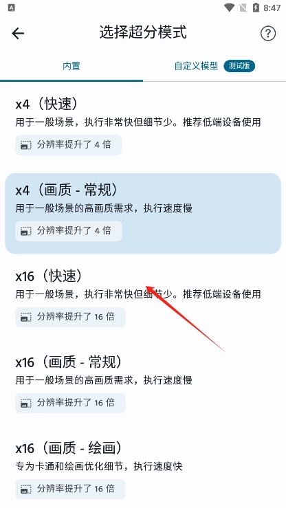 你可以在x4(快速)、x4(画质-常规)、x16(快速)、x16(画质-常规)、x16(画质-绘画)这些选项中自由切换。