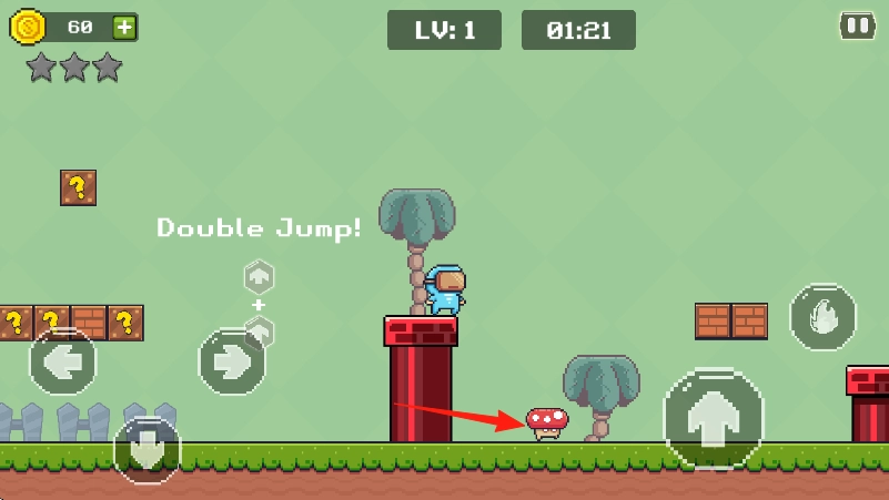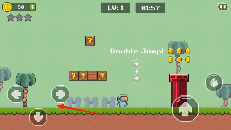 操控角色,顺着箭头指示奔跑,跃过红色管道,躲避蘑菇怪物,顶击带问号的砖块,触发DoubleJump二段跳技能,收集沿途的金币,积累游戏分数,争取晋级。