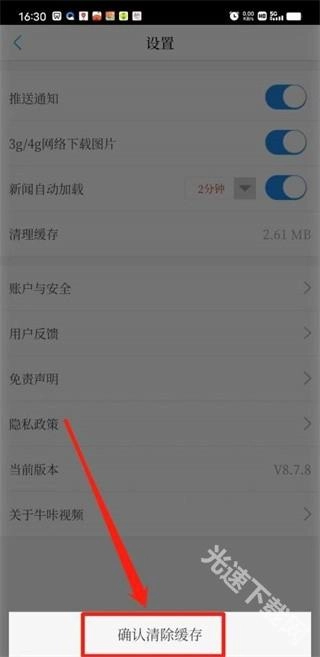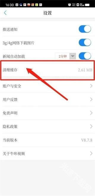 接着进入设置页面,这里面有清理缓存、账户与安全、用户反馈之类的功能,直接点击【清理缓存】选项就可以了。