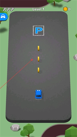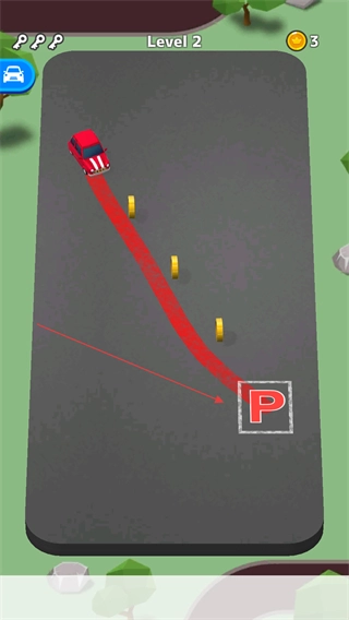 通过手绘路线操控车辆移动,需要规划路径引导车辆收集金币,并且要让车辆准确停靠到标有P的停车区域。