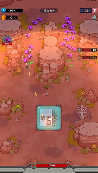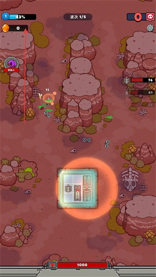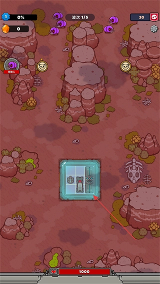 进入游戏后,先熟悉界面上的各项信息:屏幕上方的波次显示为1/5,下方的红色条代表基地生命值,接下来就可以准备抵御敌人的进攻了。