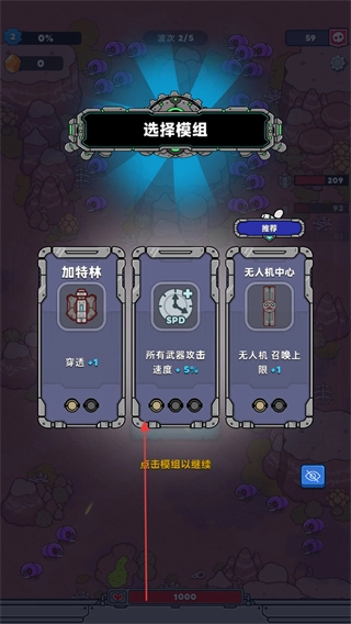 在清除掉当前这一波敌人之后,就会进入模组选择界面,像加特林这类模组都在其中,点击你所需要的模组,就能让基地的战斗能力得到提升。