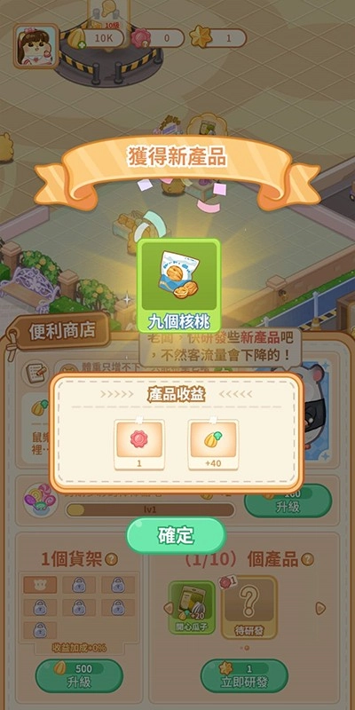 商品合成成功后,就能在超市上架新产品啦!超市里的产品种类越丰富,吸引来的顾客就会越多,业绩自然也能越来越好哦!