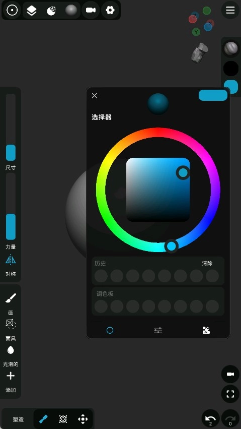 雕刻工具包括标准、粘土、粘土堆积、平滑、遮罩、膨胀、移动、修剪、展平、拉动、捏合、折痕、动态修剪、动态展平、图章以及VDM画笔等。