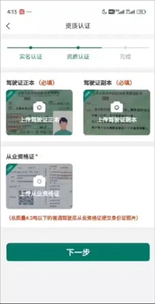 ④上传驾驶证、从业资格证等材料,点击下一步