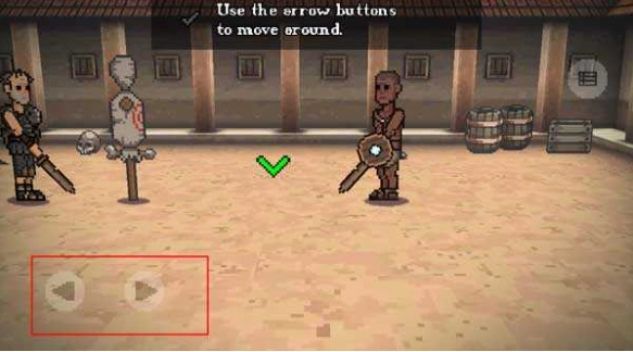 接下来是新手引导环节,第一步需要玩家借助左侧的左右方向按钮操控角色移动,待角色抵达绿色指示箭头所在位置后,即可开启下一步操作。