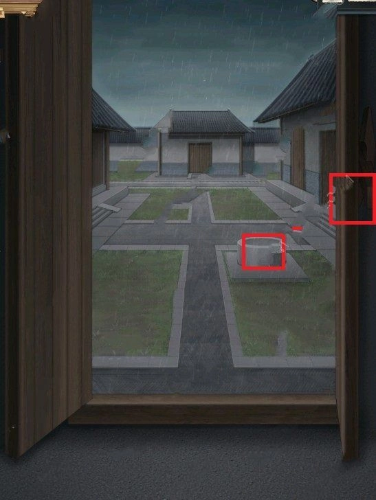 点击进入外场后,在外场区域收集柴房门、水井等物品,具体收集方式可参照图示操作。