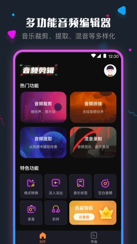 视频提取音频:把喜爱的短视频或电影导入进来,就能轻松获取其中的背景音乐音频;还能对提取的音频进行二次剪辑创作,制作成手机铃声或配音铃声,趣味性和实用性都很强。