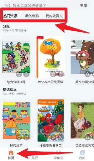 首页设有热门资源、我的制作、收藏夹等分类板块,用户能够自主挑选心仪的绘本资源开展阅读与学习活动。