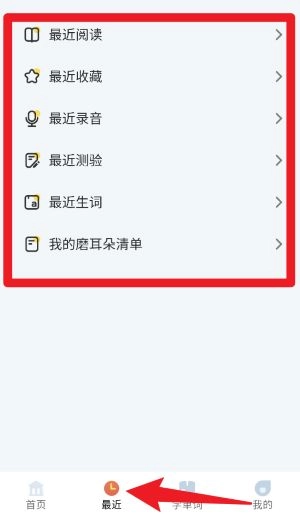 在最近页面里,你可以查看最近的阅读、收藏、录音以及测试等操作记录,这样能方便你快速回顾和复习相关内容。