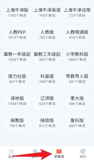 点击“学单词”按钮即可跳转至教材版本分类页面,挑选与自身学习需求匹配的教材版本后,就能开启个性化的单词学习训练环节。