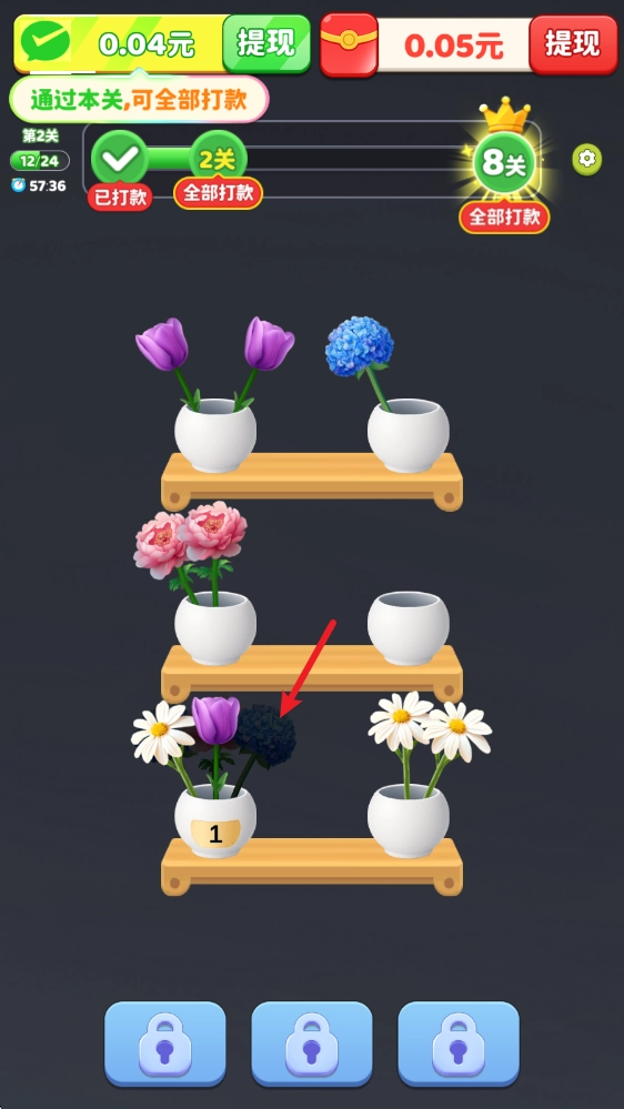 在游戏里,点击任意一朵花就能完成移动操作,花可以被移到花瓶里的空位上。