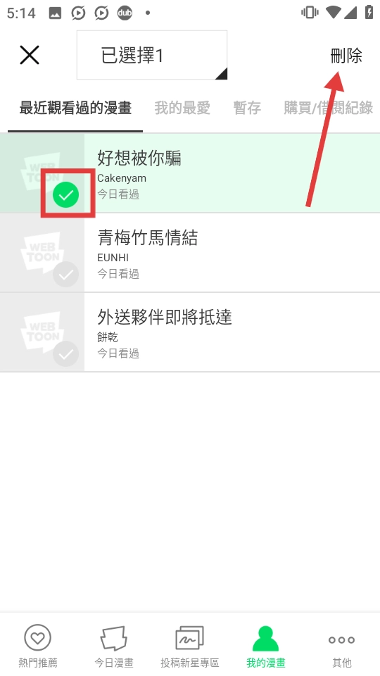选择要删除的漫畫后,点击右上角【刪除】按钮。