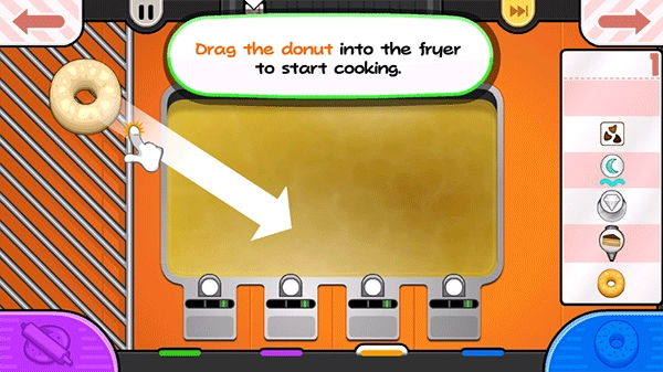游戏里有各种各样的食材,得用厨具迅速处理它们,只要处理好了,就可以去制作相应口味的甜甜圈啦。